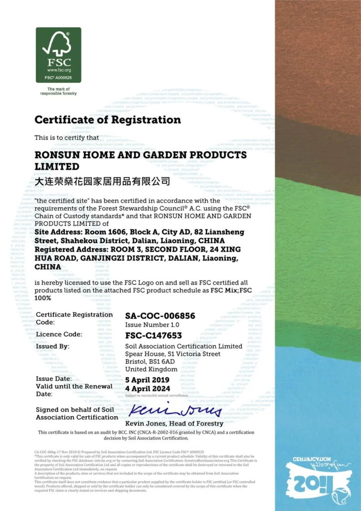 RONSUN Garden’s certificate number is SA-COC-006856. License code FSC-C147653.