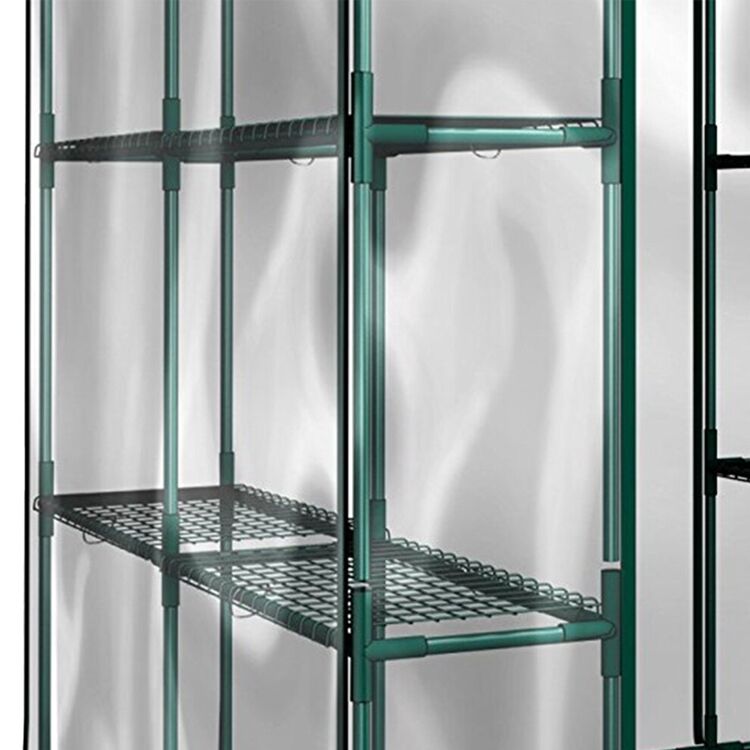 Dieses begehbare Gewächshaus mit den Maßen 143 x 143 x 195 cm bietet ausreichend Platz für den Anbau von Kräutern, Gemüse, Blumen oder die Lagerung von Gartengeräten. Die transparente PVC-Abdeckung schützt Pflanzen vor Schädlingen, Frost und UV-Strahlen, ermöglicht aber gleichzeitig die optimale Sonneneinstrahlung für gesundes Wachstum. Mit einem stabilen Metallrahmen und 8 verstellbaren Regalen ist es ideal für die Verlängerung der Anbausaison oder die Organisation von Gartenutensilien im Innen- und Außenbereich.