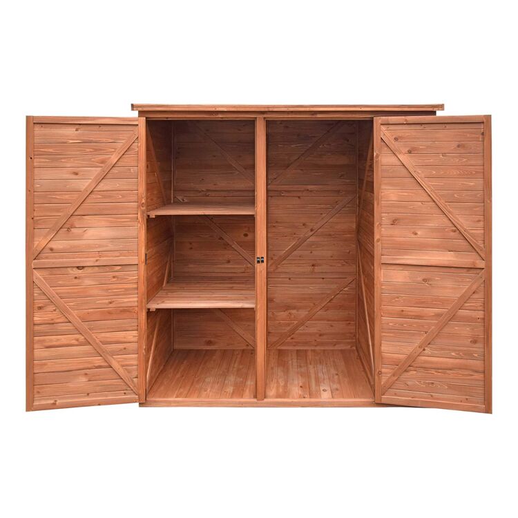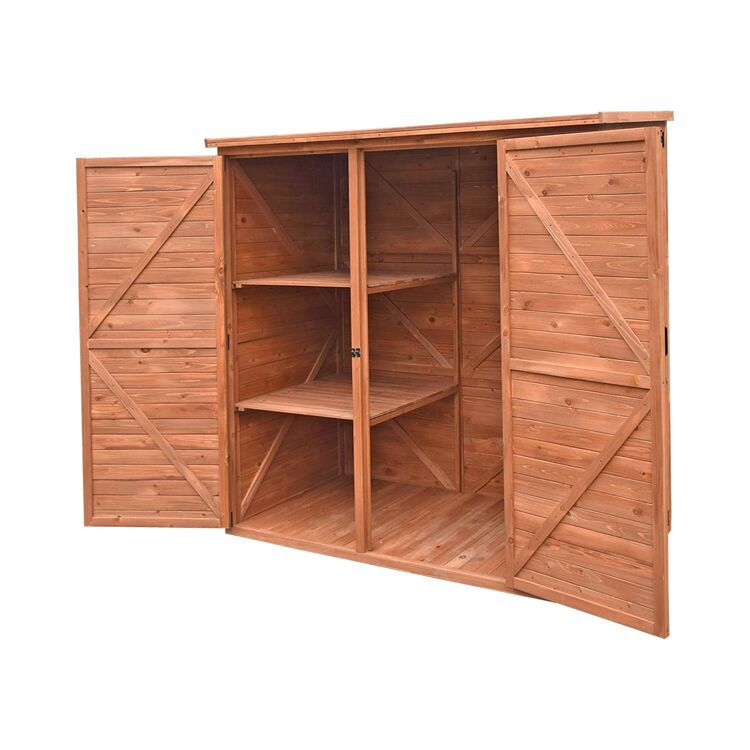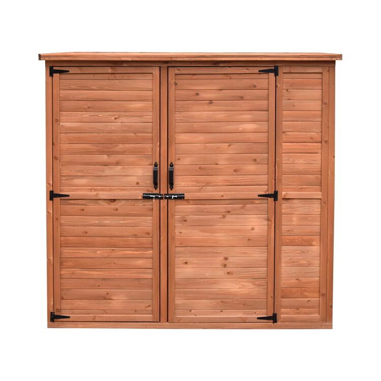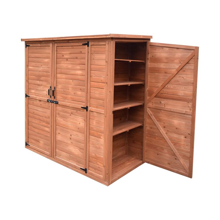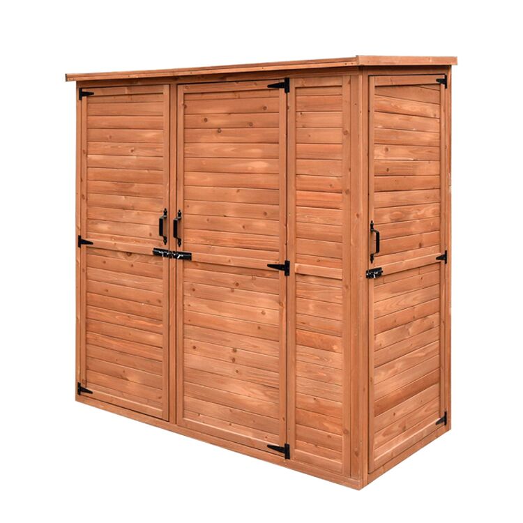 Dieser dreitürige Gartenschrank mit Pultdach bietet eine praktische und wetterfeste Aufbewahrungslösung für Ihren Garten. Gefertigt aus robustem Zypressenholz, fügt er sich harmonisch in die Gartenumgebung ein und schützt Ihre Utensilien zuverlässig vor Witterungseinflüssen. Mit seinen großzügigen Abmessungen (91 * 183 * 183 cm) und drei Türen ermöglicht er eine flexible Organisation von Gartengeräten, Spielzeug und Outdoor-Ausrüstung.