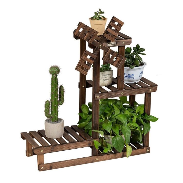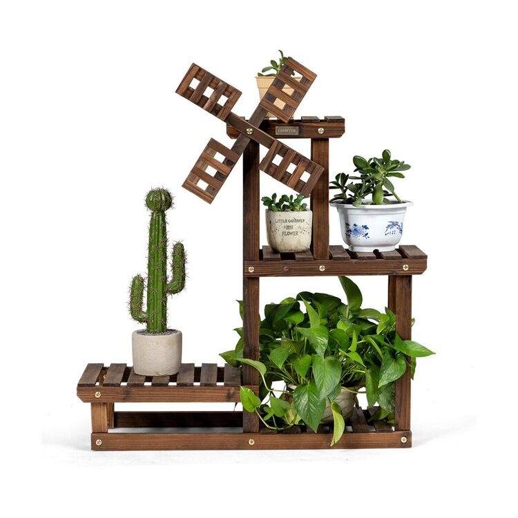 Dieser mehretagige Pflanzenständer aus Holz vereint praktische Nutzung und dekoratives Design. Mit seinem rustikalen Windrad-Akzent und den lattenartigen Regalböden eignet er sich ideal für die platzsparende Präsentation von Topfpflanzen auf Balkonen, in Gärten oder Wohnbereichen. Die vertikale Struktur maximiert den Stellplatz, während die offene Lattenkonstruktion für optimale Belüftung, Sonneneinstrahlung und Wasserablauf sorgt – ideal für gesundes Pflanzenwachstum.