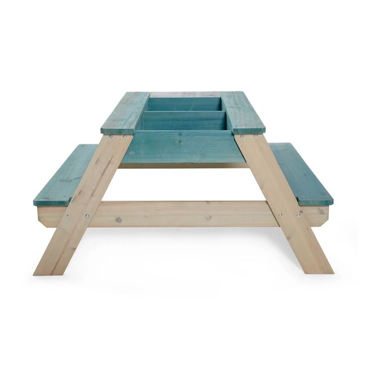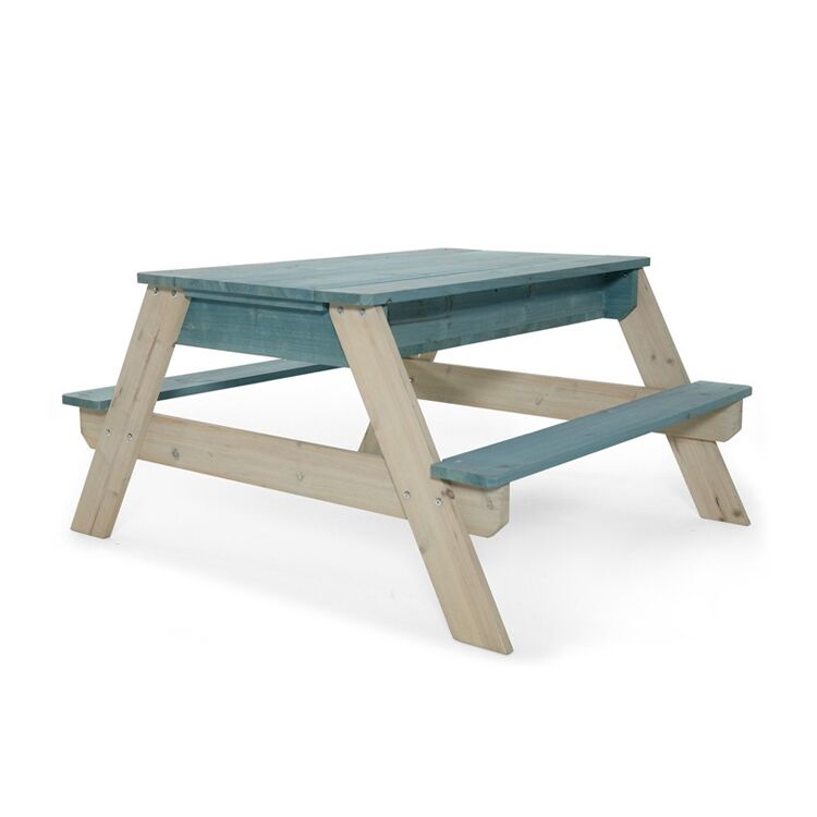 Umwandelbarer Sand- und Wasser-Spieltisch aus Holz. Wird zur Picknickbank. Für sensorischen Spielspaß im Freien ab 3 Jahren. Fördert Kreativität & Gemeinschaft.