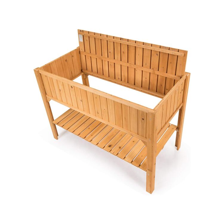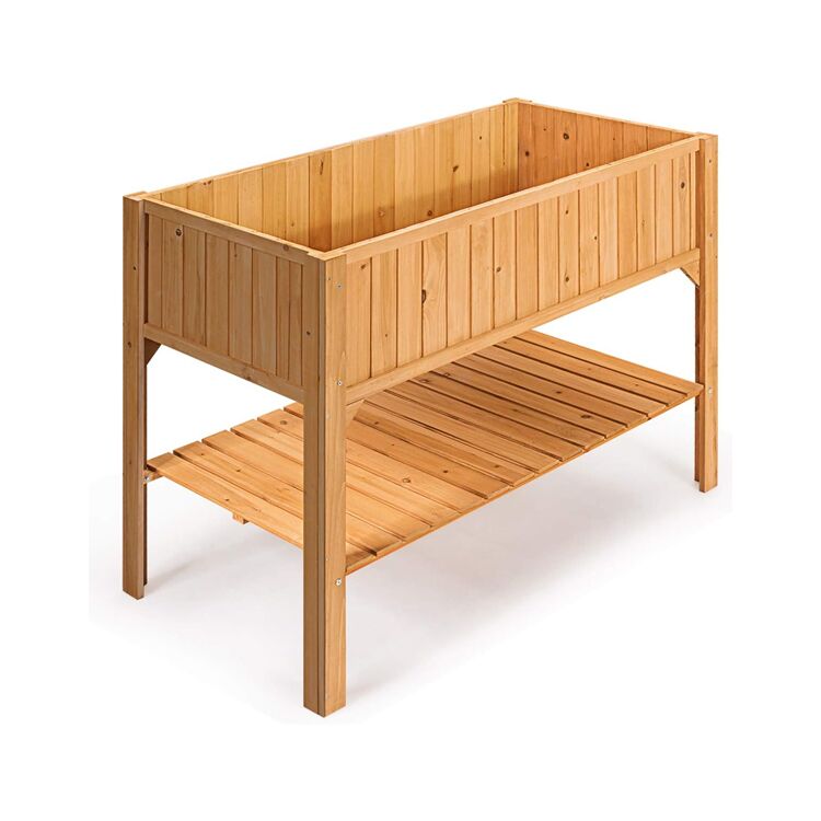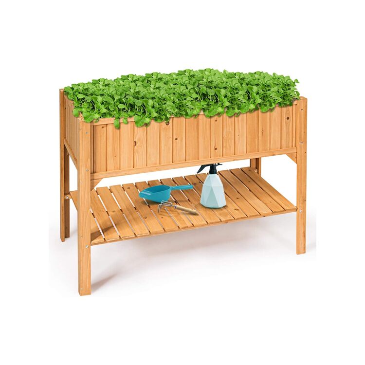 Esta cama elevada de jardín de dos niveles está fabricada en robusta madera de abeto, ideal para cultivar hortalizas, hierbas o flores en terrazas o balcones. Su diseño ergonómico de 76 cm de altura facilita la siembra y el mantenimiento sin necesidad de agacharse, mientras que el estante inferior integrado ofrece espacio adicional para herramientas de jardinería. Incluye orificios de drenaje para evitar el encharcamiento y garantizar un crecimiento saludable de las plantas.