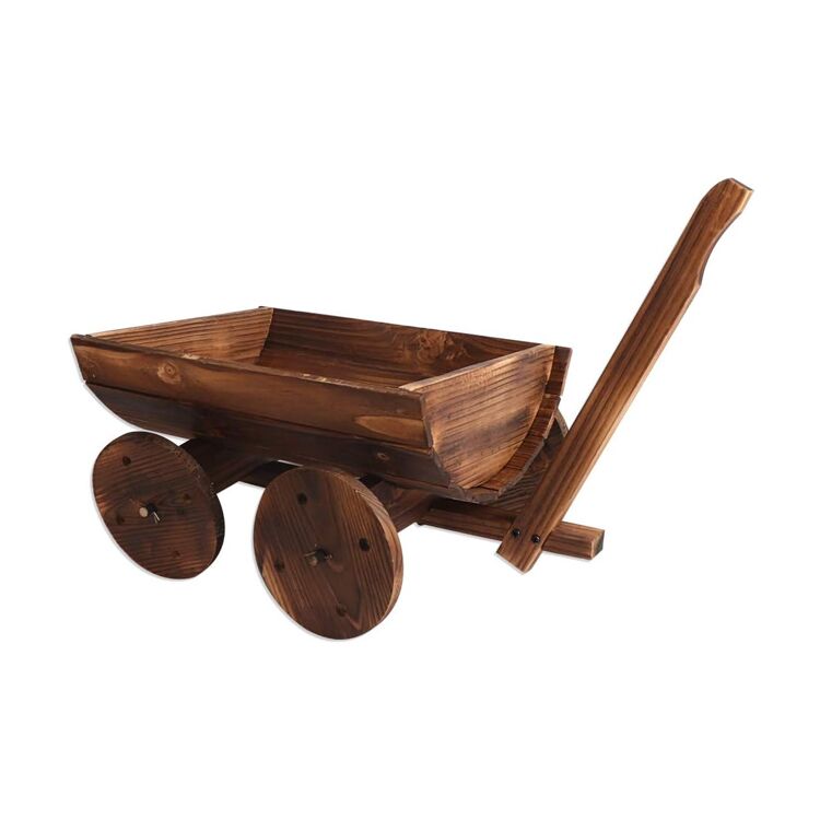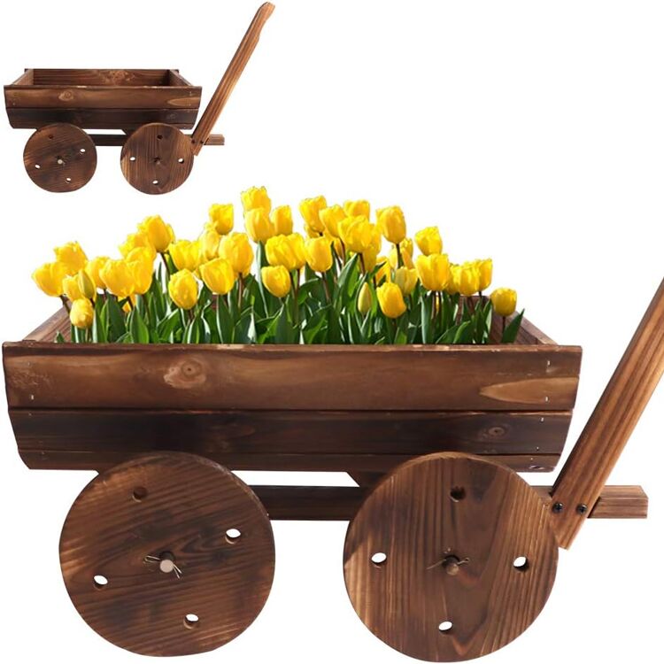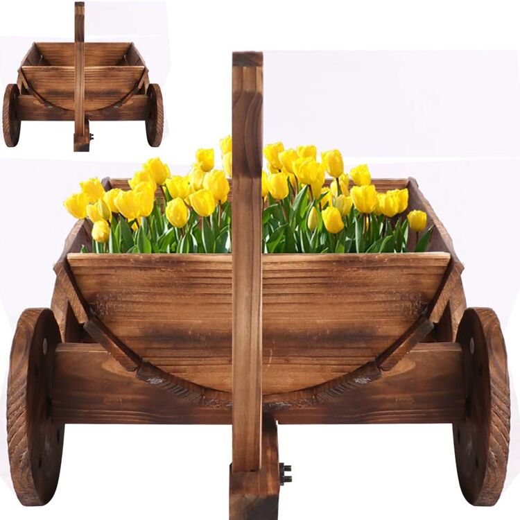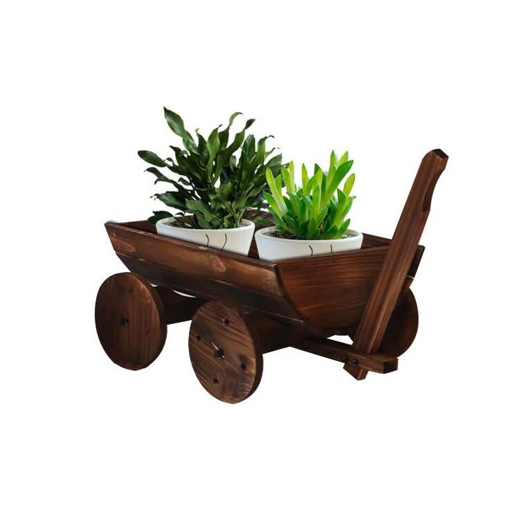 Carretilla jardinera de madera con ruedas, diseño compacto y drenaje ideal para plantas. Perfecta para decorar jardines, terrazas o balcones. ¡Mobilidad y estilo rústico!