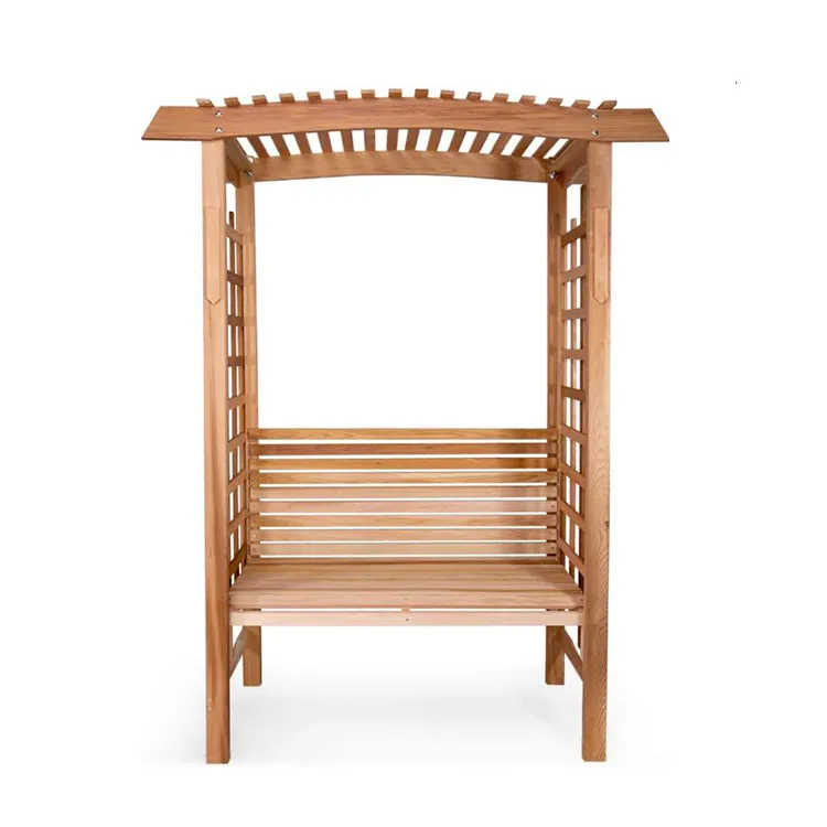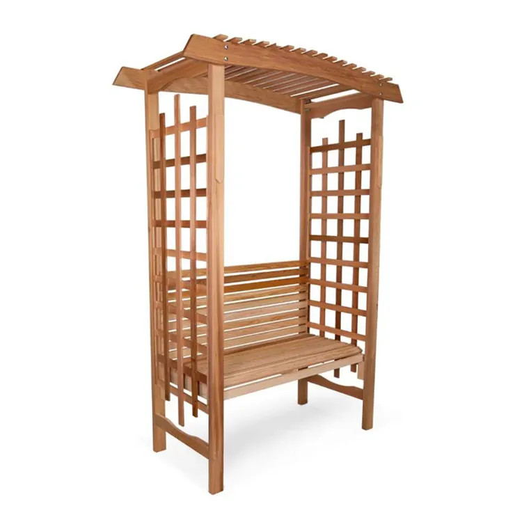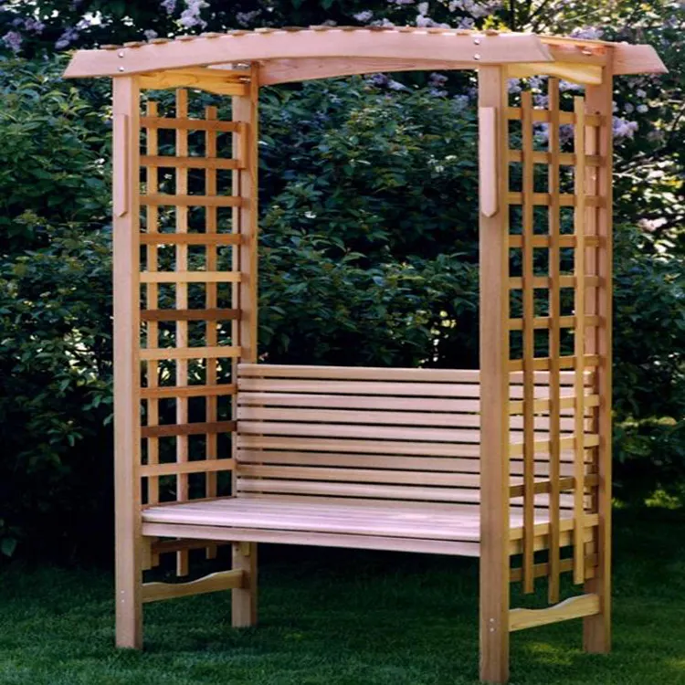 - Diseño 2 en 1: Integra un banco de madera bajo una pérgola arqueada, perfecto para relax o como soporte para enredaderas como rosas o hiedras.