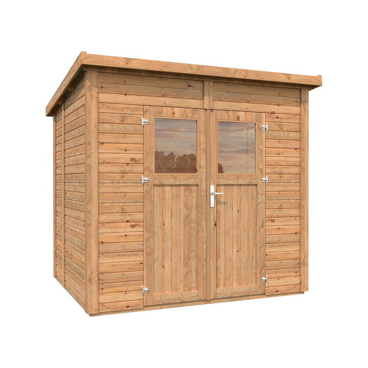 Cobertizo de madera impermeable con techo inclinado, ventanas de plexiglás y cerradura. Ideal para almacenar herramientas y equipos en exteriores. Personalizable y fácil de montar.