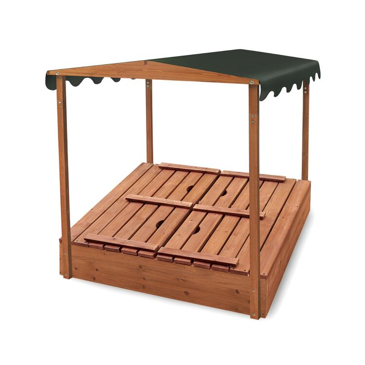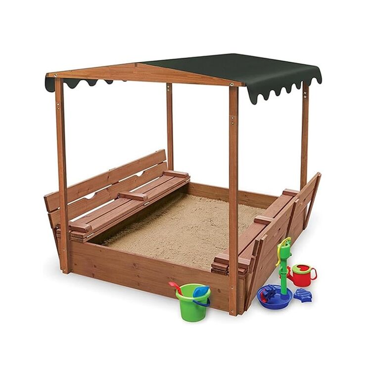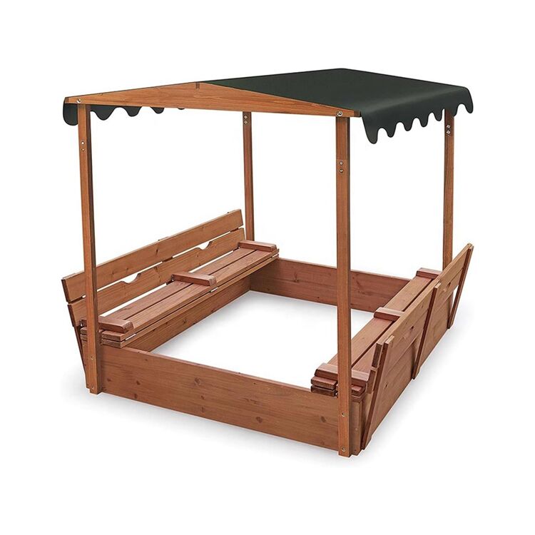Ce bac à sable extérieur allie fonctionnalité et durabilité. Conçu pour les enfants, il inclut un store protecteur contre le soleil et des bancs convertibles en couvercle. La structure en bois robuste et sans fond assure une bonne drainage et une longue durée de vie.