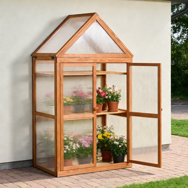 Compact 3-tier mini greenhouse with a fir wood frame and polycarbonate panels. Ideal for year-round plant growth on balconies, patios, or indoors. Features adjustable shelves and excellent weather protection.