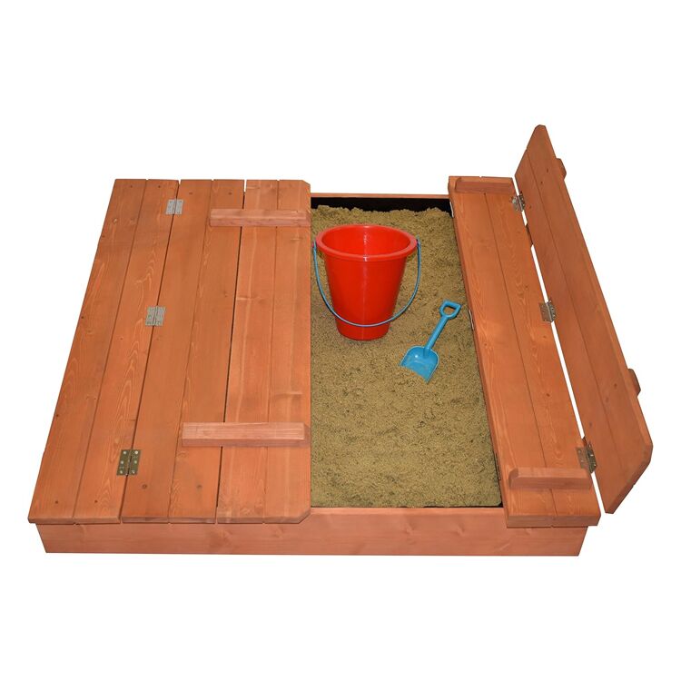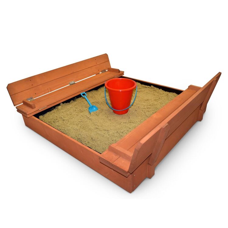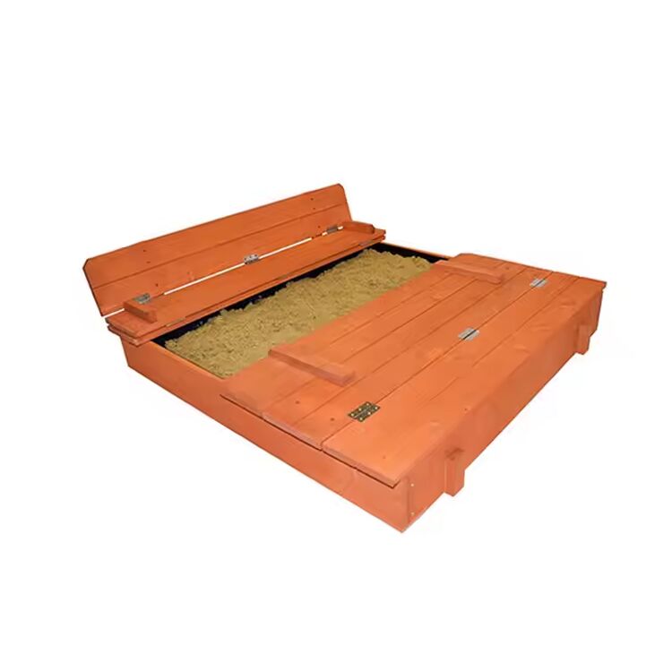 This premium wooden sandbox offers a versatile and durable play space for children in any backyard or garden setting. Crafted from high-quality, weather-resistant solid wood, the structure features a unique convertible top. This innovative design allows the lid to transform easily into two comfortable bench seats with sturdy backrests, providing a clean and dedicated area for kids to sit while they play. When playtime ends, the benches fold flat to create a secure cover that protects the sand from debris, rain, and pets.