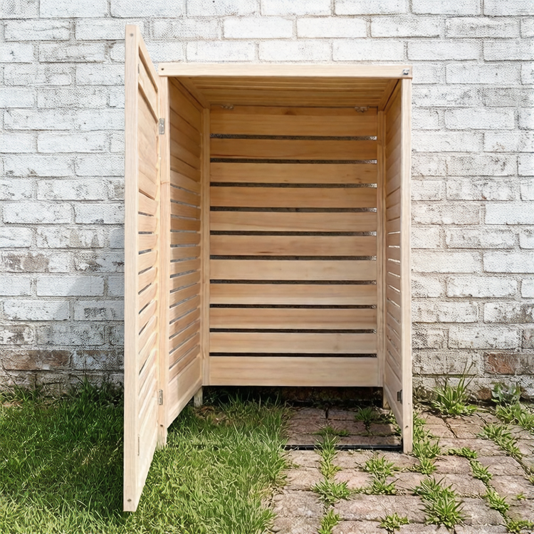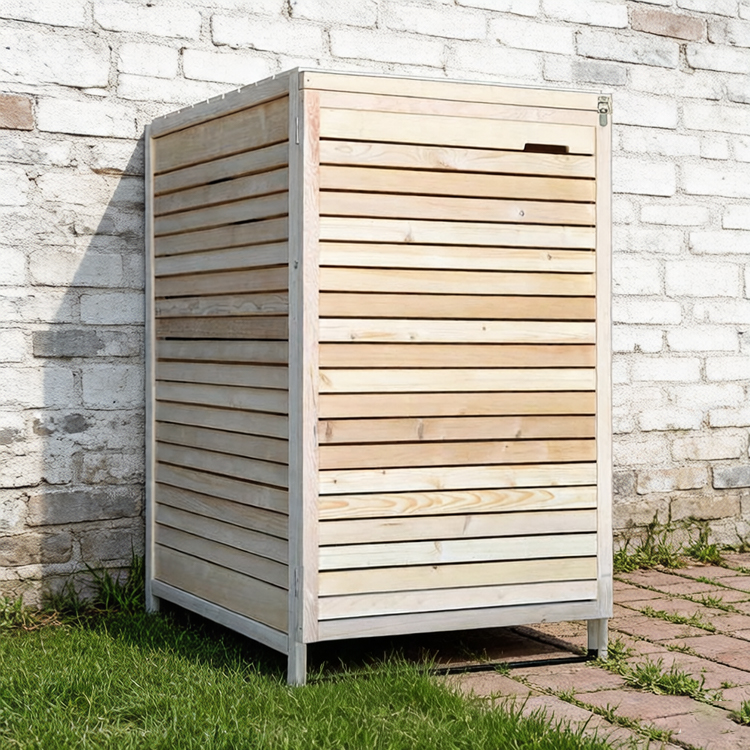 This pre-assembled pine wood garden bin storage unit measures 674×772×1110mm and is designed to discreetly house 120L-240L wheelie bins. Crafted from solid pine, it combines natural durability with a sleek, functional design ideal for gardens or entryways. The unit features a reinforced structure for freestanding stability, weather-resistant properties, and practical accessories like a magnetic door closure and chain-assisted lid. As a reliable garden bin storage supplier for retail brands, it offers expandable modular panels for customization, making it a versatile outdoor storage solution.