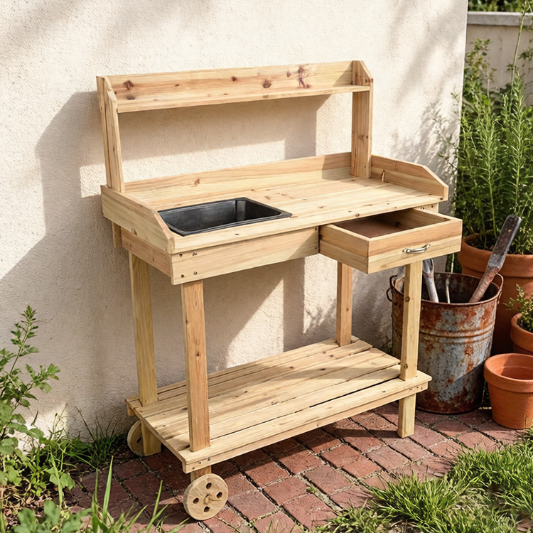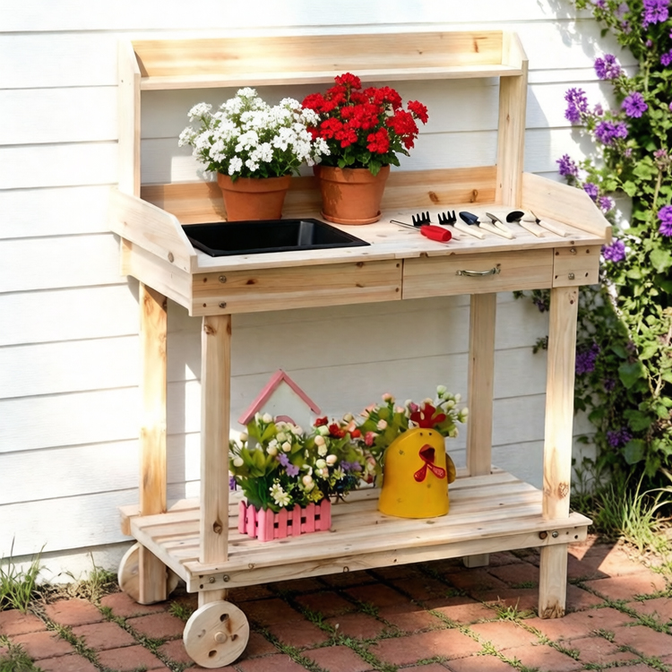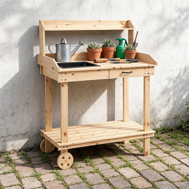 2-tier Garden Potting Table made of solid fir wood—with removable sink, drawer, shelves, and wheels. This manufacturer’s versatile workstation offers ample storage, 50kg load capacity, and customization for compact gardening spaces, perfect for bulk orders.