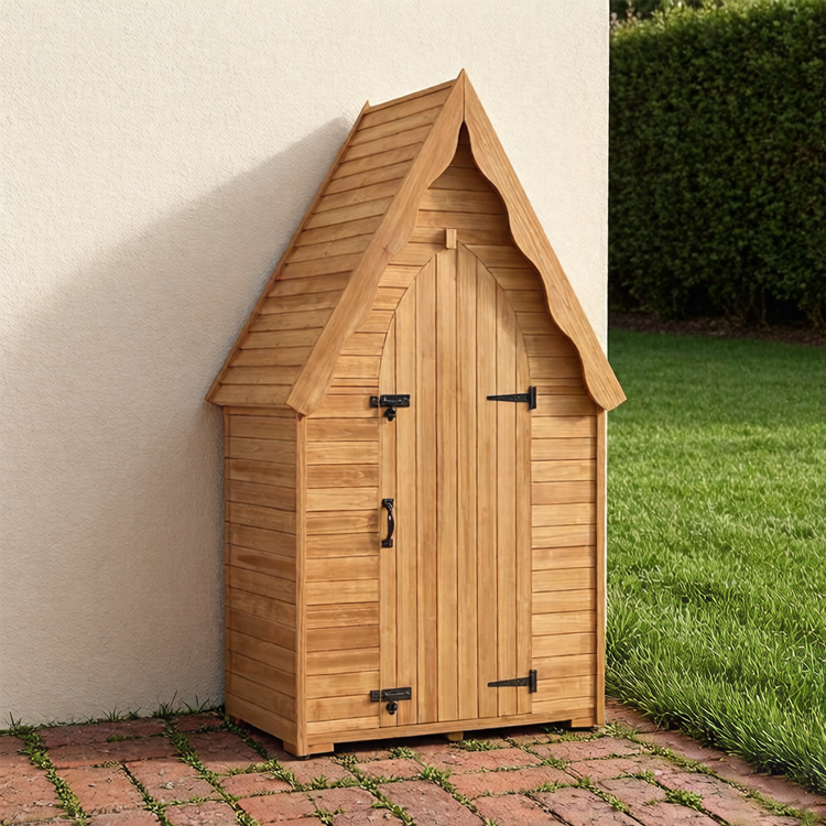 - Vertical Storage Design: Includes a tall compartment for long-handled tools and an arched door for easy access.