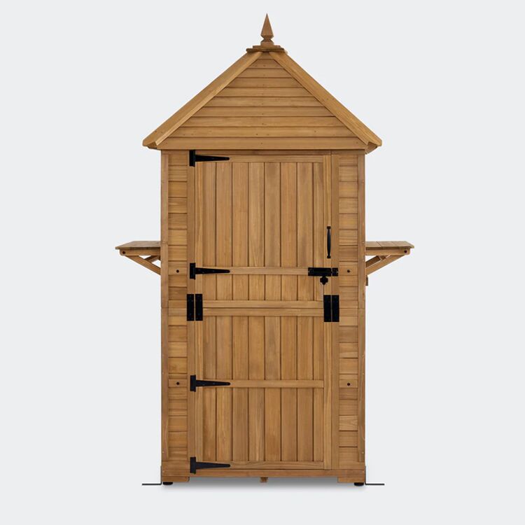 Solid Wood Vertical Garden Tool Shed with Foldable Side Tables and Adjustable Shelving