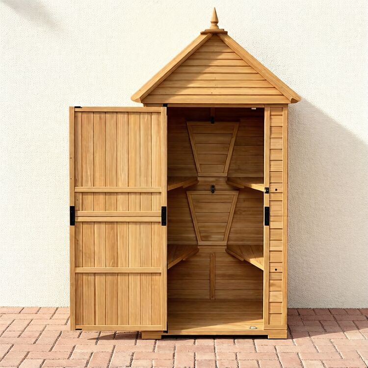 This vertical outdoor storage cabinet offers a high-capacity, space-saving solution for organizing garden essentials. We manufacture this unit using durable, weather-resistant solid wood to ensure long-term stability in various outdoor climates. The slim tower design fits perfectly in narrow side yards, patios, or balconies, providing professional-grade organization for both hobbyist gardeners and professional landscapers.