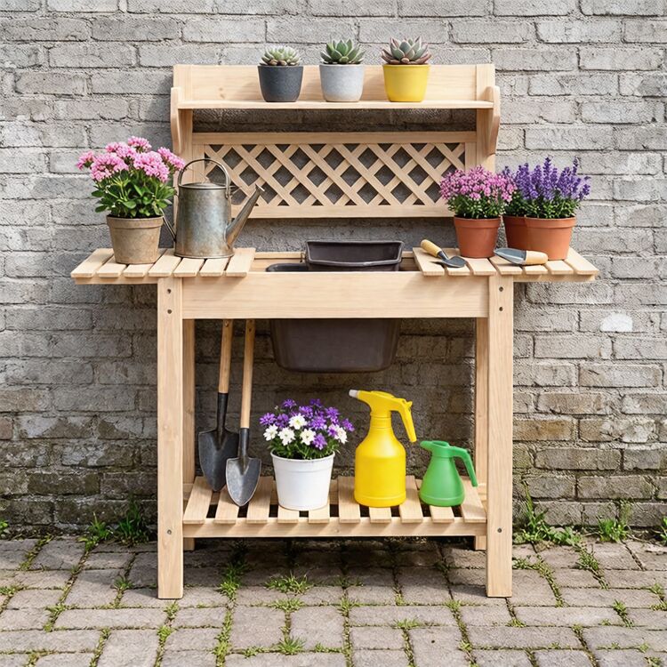 Wood potting bench with storage featuring a spacious worktop, removable sink, shelves, and drawer for organized and comfortable gardening tasks.